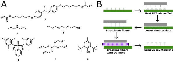 (a) Molecular structures of the compounds used to synthesize the oligomers for the fibers. (b) schematic of the fiber production process.